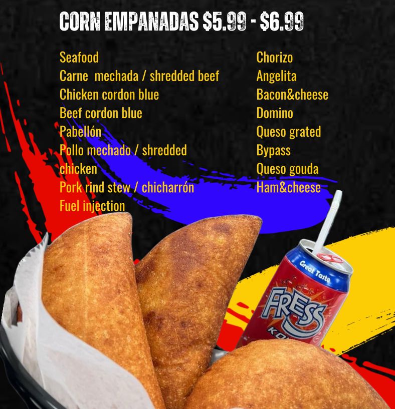 Enjoy the delicious Sweet Corn Cachapas, stuffed with succulent hand cheese and shredded chicken. With their fresh sweet corn flavor, these cachapas are the perfect option to satisfy your cravings. Order them now and delight your palate with this incredible combination of flavors! Disfruta de las deliciosas Cachapas de Maíz Dulce, rellenas de suculento queso mano y pollo deshebrado. Con su fresco sabor a maíz dulce, estas cachapas son la opción perfecta para satisfacer tus antojos. ¡Ordén