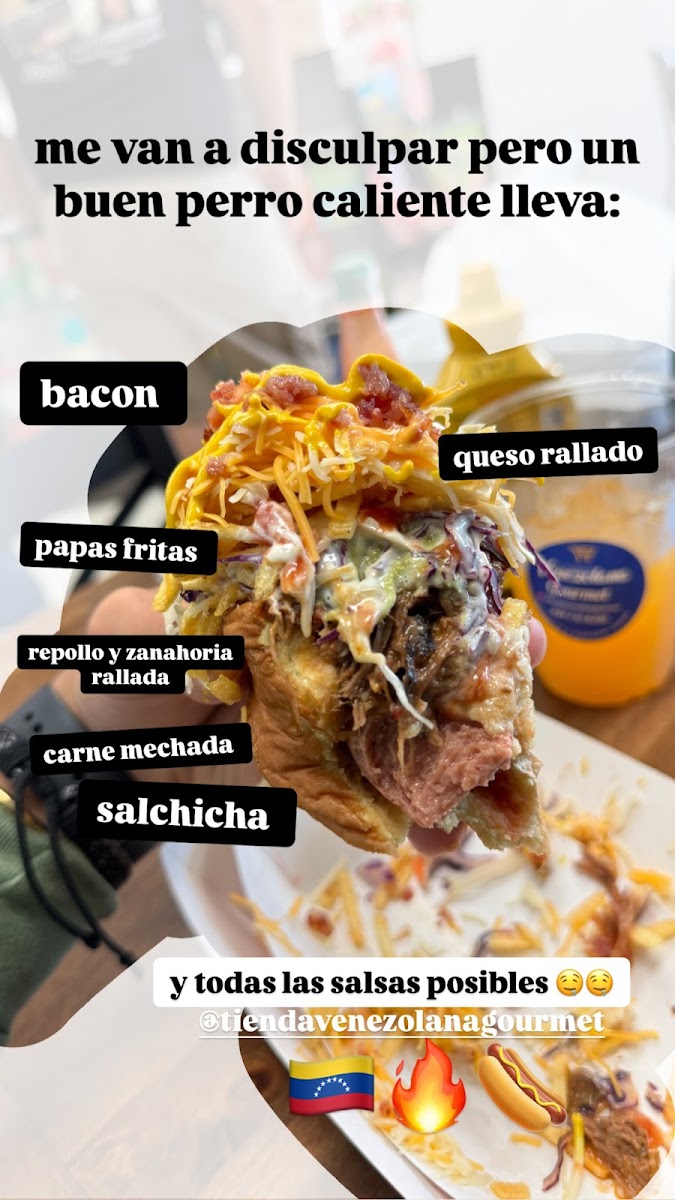 Bun, jumbo beef sausage, bacon, chopped onion, shredded cabbage and carrot salad, potato sticks, shredded cheese, sautéed corn, mayonnaise, ketchup BBQ sauce, tartara homemade sauce. Pan, salchicha jumbo, carne, tocineta, cebolla, ensalada de repollo con zanahoria, papitas, queso rallado, maíz salteado, mayonesa, ketchup, salsa BBQ, salsa tártara de la casa